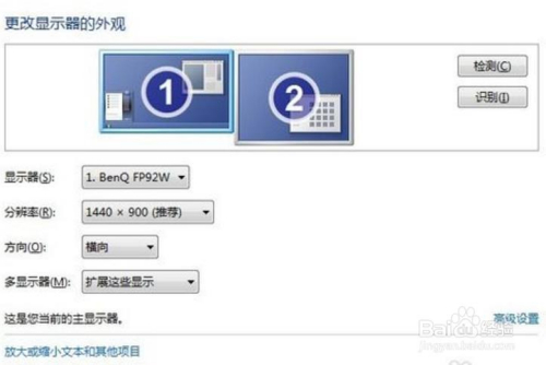 将两台显示器都毗连上电脑后,默认环境下是“扩展显示”的功能。所谓扩展显示,就是将显示画面扩年夜到两个显示器的规模,例如我的机械是一台 1440X900分辩率与一台1280X1024分辩率的机械,扩展显示后 总分辩率就是 1440X900+1280X1024。