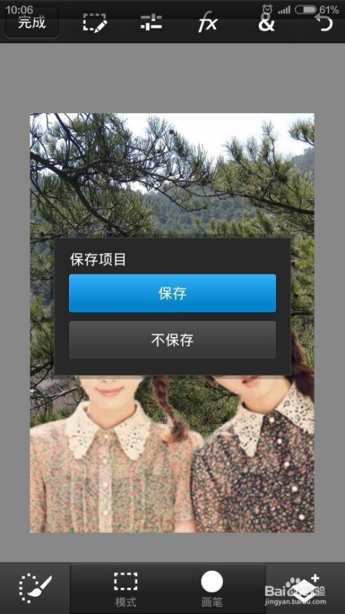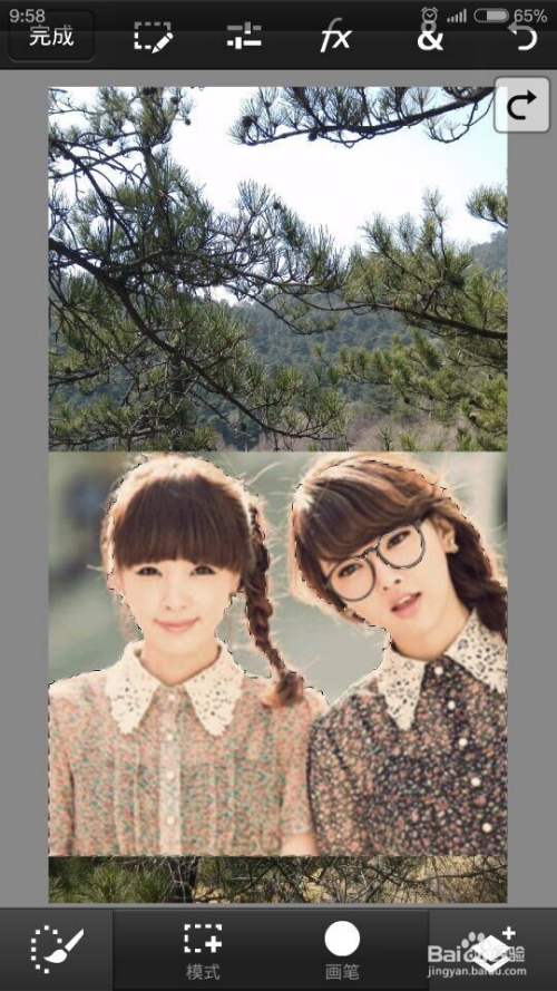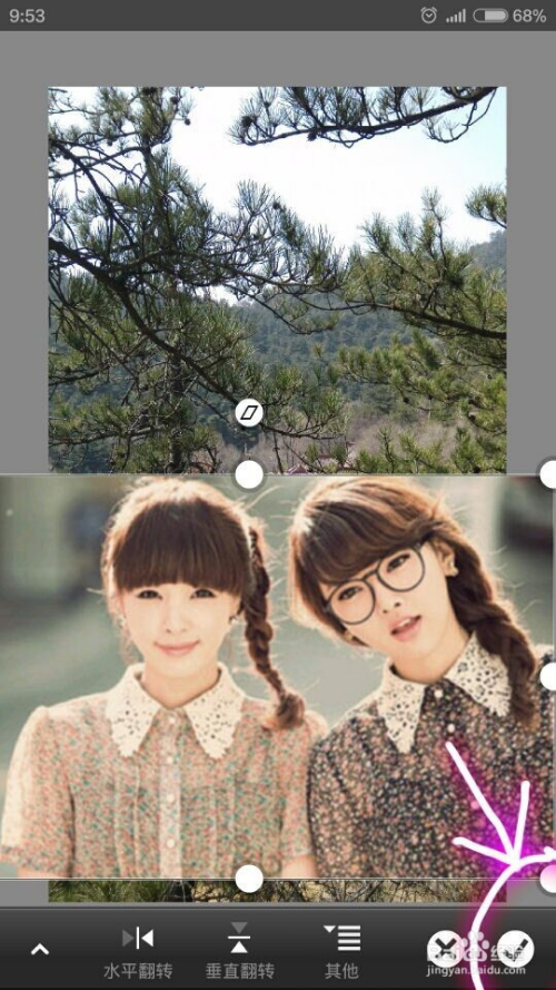 两张照片都添加之后,调整上面的图片大小及位置,移动好后,点击下面的对号。成果如图。