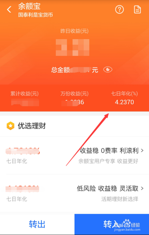 转入当作功后,再次进入余额宝界面,此时发现余额宝对接的基金变了,7日年化收益也变高了,如下图所示。