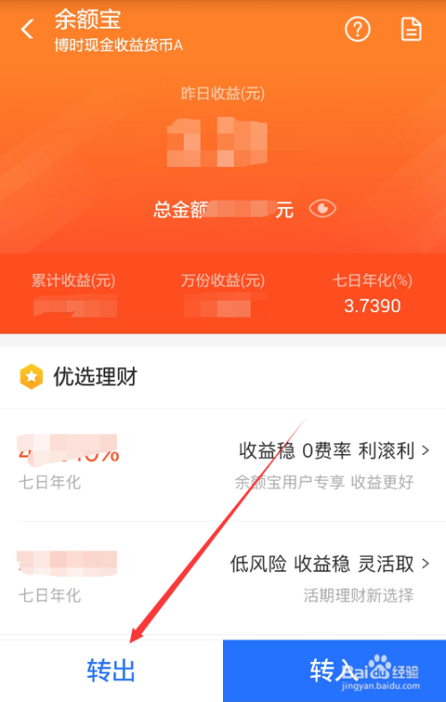 当余额宝里有钱的时辰,在余额宝界面里直接点击下面的【转出】,如下图所示。