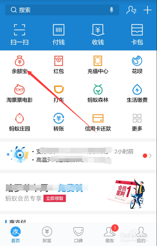 打开手机付出宝,在付出宝界面里找到【余额宝】直接点击进入,如下图所示。