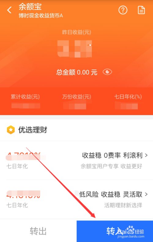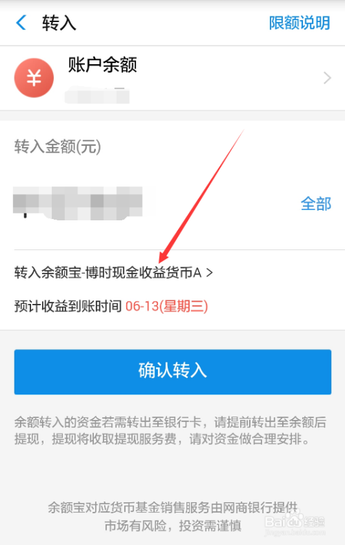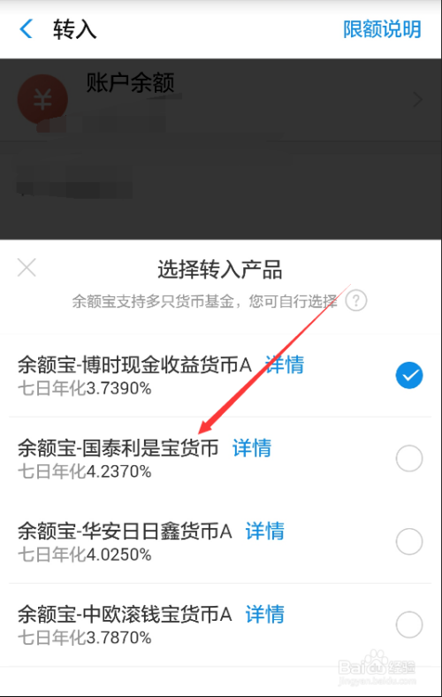 点击后余额宝直接弹出选择转入产物的选项,不消看了,直接点击收益高的吧,如下图所示。