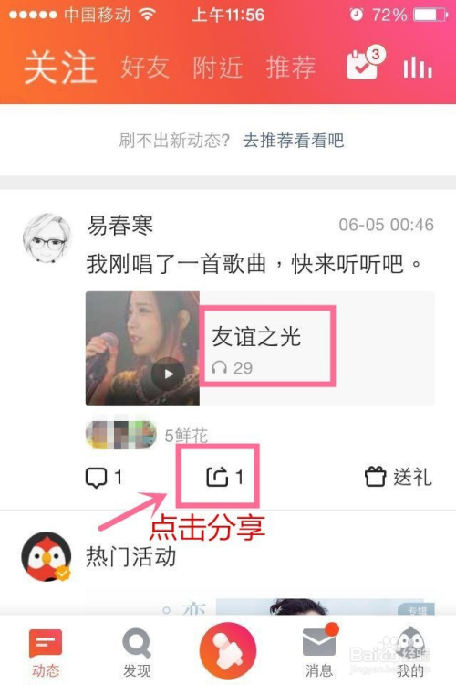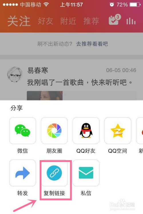 找到要下载的《友情之光》歌曲后,我们点击“分享”(如箭头)所指的图标,点了分享之后,然后点击复制链接,请注重是复制链接而不是分享到微信、朋友圈、QQ等其它处所。