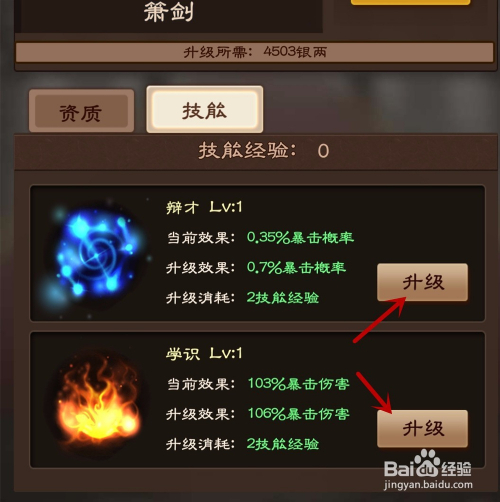之后我们可以看到好几个技术,我们按照食客的属性分歧,点击需要进级技术,后面的【进级】按钮,即可给食客进级技术当作功,如图所示。