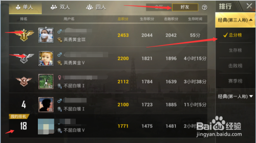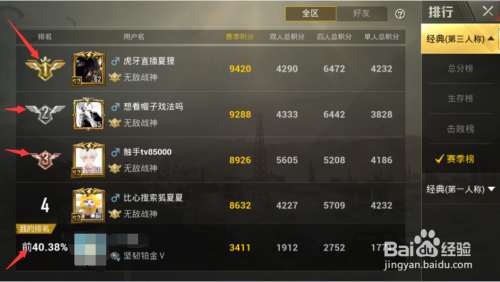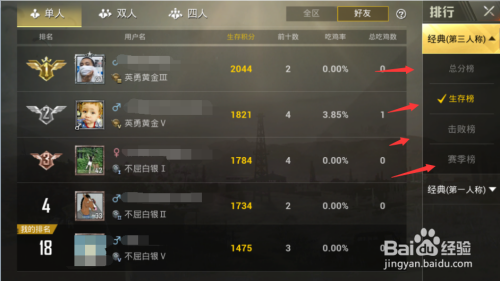 我们不一定非要看总分榜可以看看其他的排行,保存榜,击败榜,赛季榜啊都可以看,每个人的阐扬纷歧样嘛,最后祝大师游戏兴奋,年夜吉年夜利,晚上吃鸡。