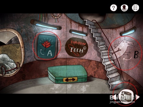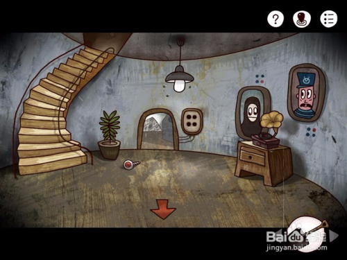 5、墙上的画眼睛所看的偏向就密码,对应的位置在墙上(我都用红色的圈全出来了)一楼两个密码,点击楼梯上楼,二楼和三楼各有一位密码。集齐密码就可以开启出灯塔的密码。