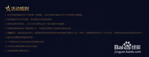 5. 温馨提醒:请在活动时候内,将道具发送到您的游戏仓库内或者分化为CF点,不然,宝箱领取竣事后5个工作日内,道具将主动发放至您的仓库中;