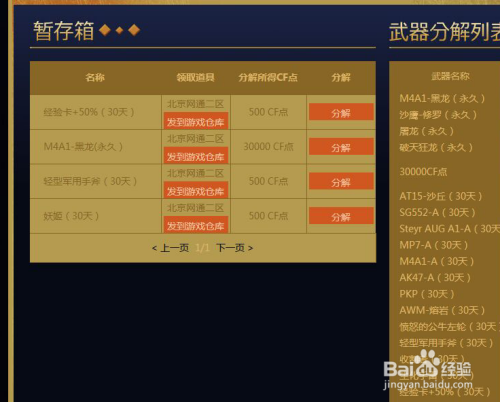 4. 获得的道具存放在【暂存箱】中,可选择分化当作CF点或发往游戏仓库;