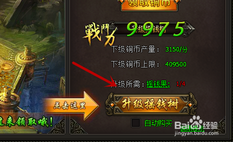 最后我们点击右侧的【进级钱树子】,可以提高钱树子的品级,从而提高铜币的产量,进级的时辰需要耗损摇钱果,如图所示。