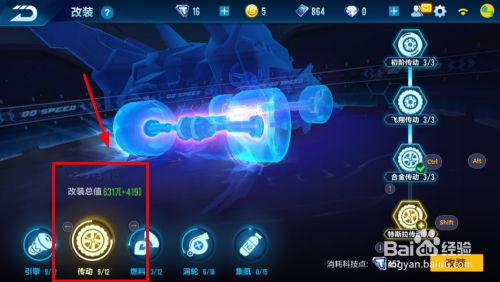 在改装界面改装你的“引擎/传动/燃料/涡轮/集氮”选项