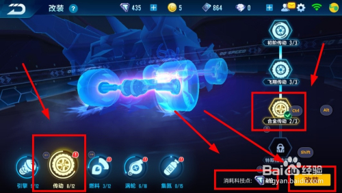 小编以改装“传动”为例,在传动选项点击“合金传动”,会对应耗损科技点,点击“改装”