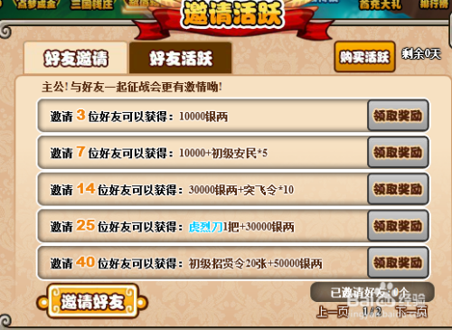 我们还可以邀请老友来玩这个游戏,邀请当作功必然的人数,可以获得银两的奖励,累计人数越多,获得的银两也越多。