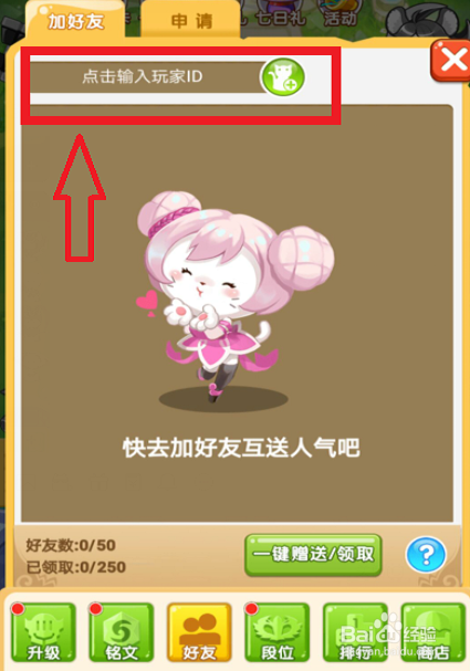 在上端的棕框里纳入id,再点右侧的绿标,使其搜出,这是本家儿加的门径,后面有个‘申请’黄钮,可显他端有无发申。
