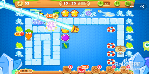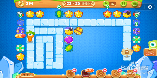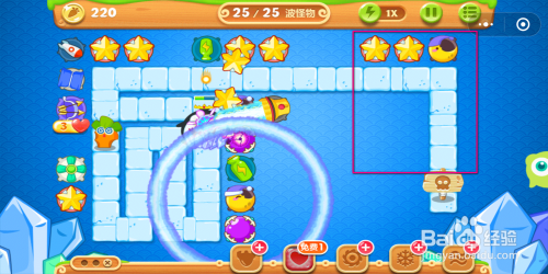 到最后一波怪物时,当图示位置的炮塔超出射程无法进犯时,可以将这些炮塔打消失落,然后用获得的萝卜在前面位置能进犯到怪物的处所建造更多的炮塔。