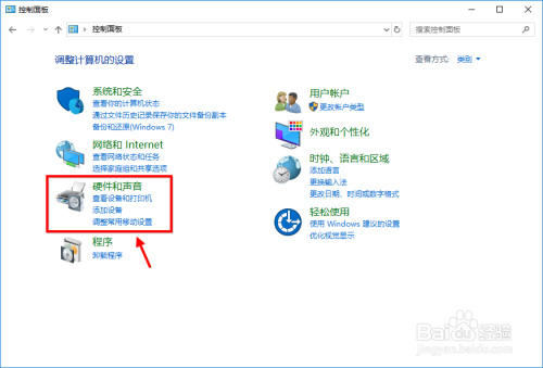 在节制面板中,我们点击硬件与声音。