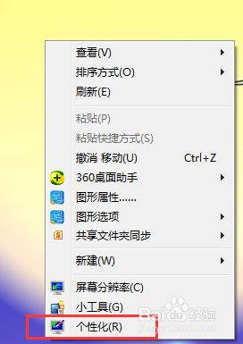 桌面空白处右击,在右击菜单中选择“个性化”;