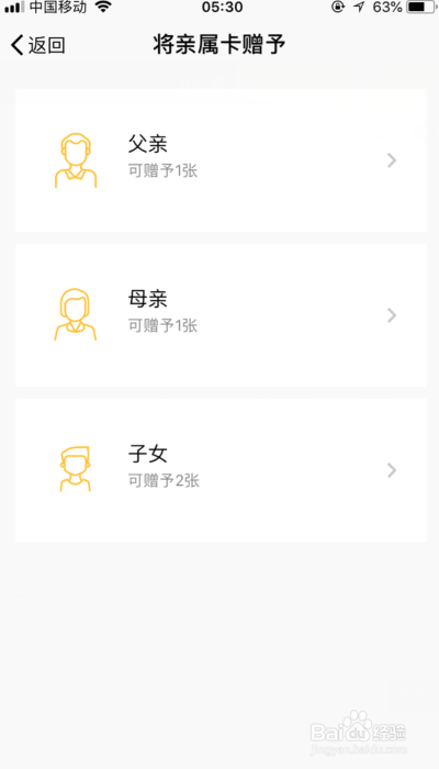 点击赠予亲属卡后,会呈现下面的页面,显示本身可以一共赠予的亲属卡,怙恃各一张,后代2张,想赠予给谁就点击谁。