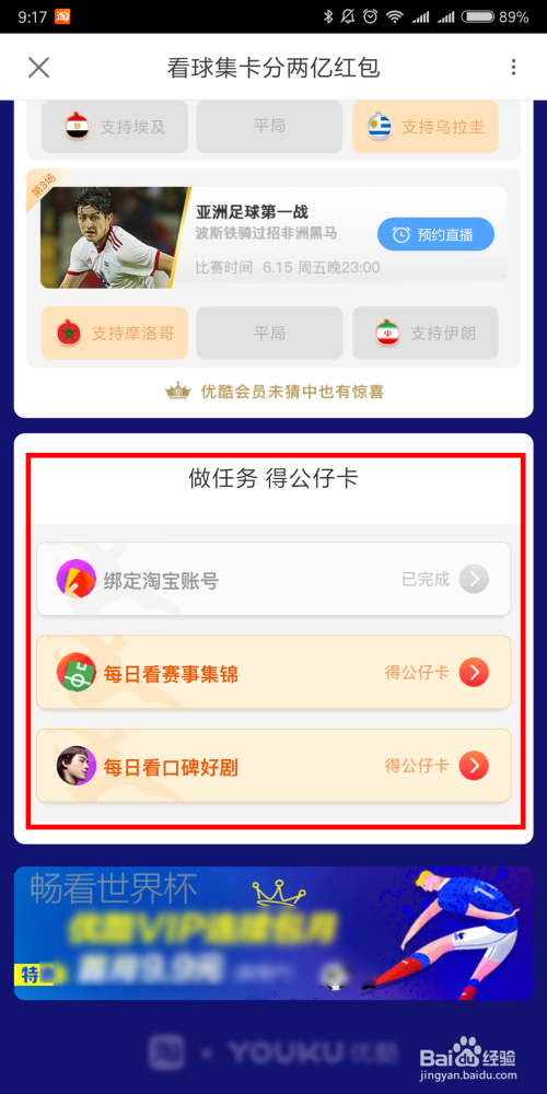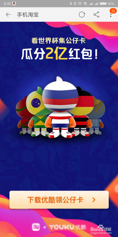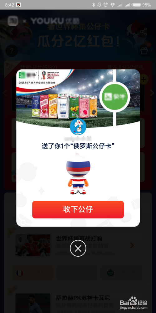 点击后,若是你的手机没有安装优酷视频,会提醒你下载优酷,也是可以获得公仔卡的哦。除此外宿世界杯开赛后,看球赛也可以获得公仔卡哦。