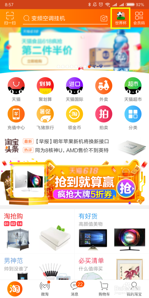 首先打开手机淘宝APP,在右上角有一个宿世界杯的logo,我们点击打开。