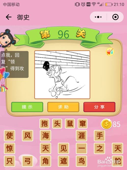 御史96关谜底:图片上的老鼠抱着本身的头处处乱窜,这种环境叫做【狼狈】,看上去很是的狼狈。