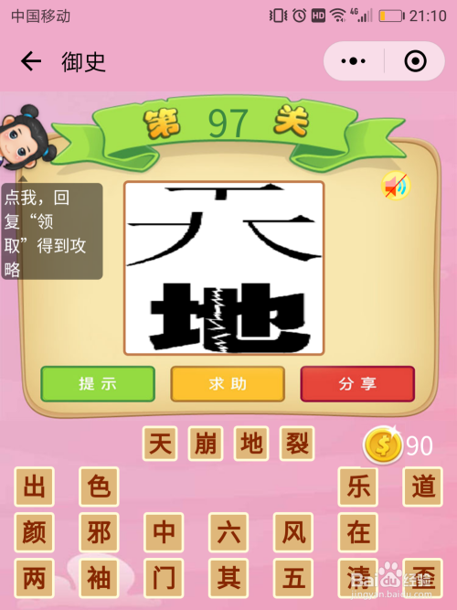 御史97关谜底:当作语中必有图上的两个文字,不雅察文字并不完整,天崩开了,地裂开了,这即是【天崩地裂】。