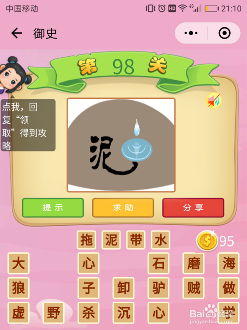 御史98关谜底:泥字拖这一个长长的从头至尾巴,而从头至尾巴后面则是水,这就能猜到当作语【牵丝攀藤】。