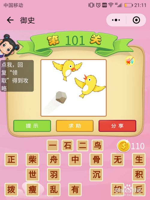 御史101关谜底:注重图片上的信息,石头和鸟儿。几个石头?1个。几只鸟儿?2只,那图片暗含的当作语就是【一举两得】。