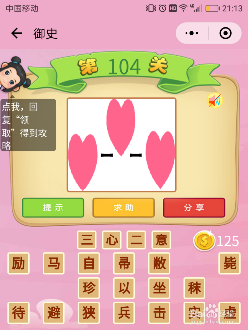 御史104关谜底:这又是个数字图形图,注重几个心?三个。几个一字?两个。一谐音意,这即是当作语【三心二意】。
