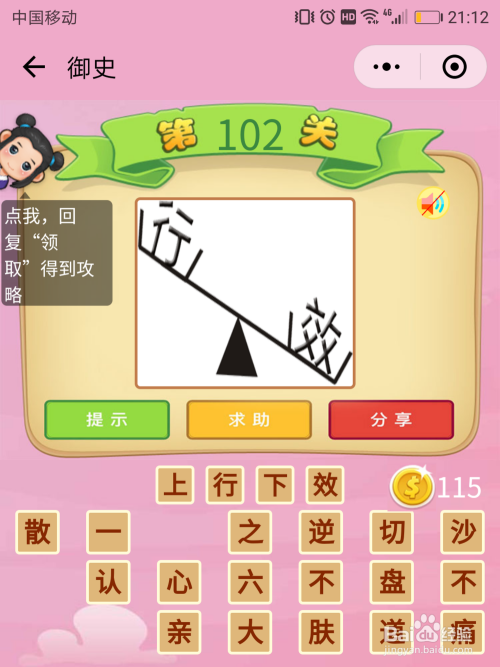 御史102关谜底:跷跷板上别离是两个汉字,一上一下,上面是行字,下面是效字,这就是当作语【上行下效】。