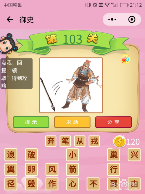 御史103关谜底:一小我把一支笔丢了,丢笔既是弃笔,穿上了盔甲,弃笔是为了参军,这种现象称为是【弃笔从戎】,和弃文就武是一个意思。