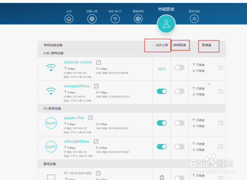 7. 选择【终端办理】,设置是否【许可上网】,是否想【收集限速】以及限速值
