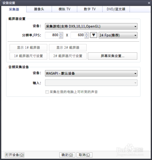 在上方的“设备”选项中选择"利用 GDI 默认屏幕采集"。