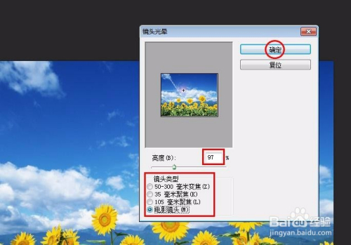 第五步:弹出“镜头光晕”对话框,按照需要进行设置,设置完当作后单击“确定”按钮。