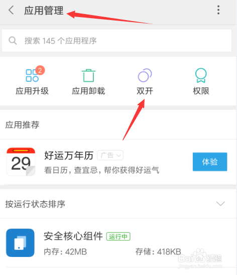 在手机的平安中间应用办理里也可以打开双开