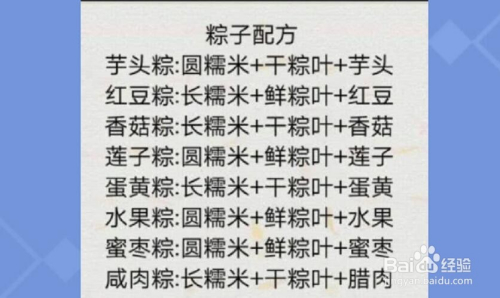 每种口胃的粽子都有他专门的配方,配方不合错误建造出来的就是暗中粽子,可是不算的哟,那么8种粽子的配方别离是什么呢?往下看,往下看!