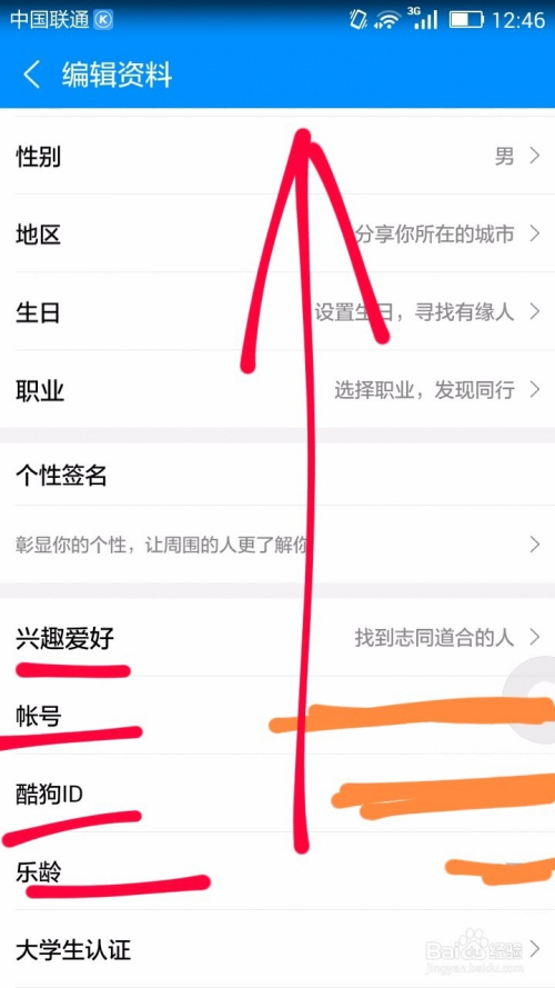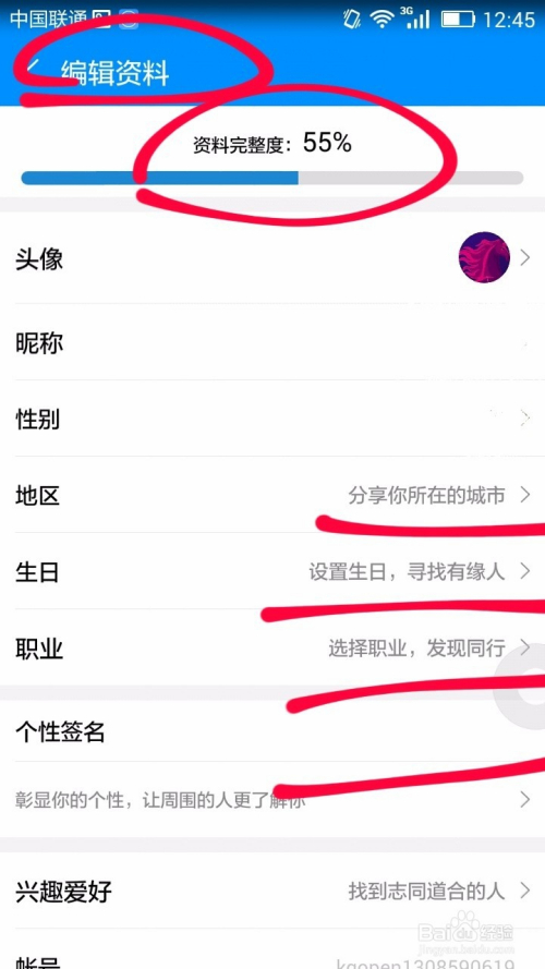 顿时,我们就会看到编纂资料页面呈现在手机屏幕上,从中可以看到小我资料的环境,我们可以进一步完美这份资料;