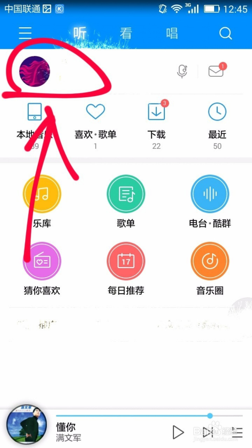 这时,在打开的音乐应用中,我们可以或许看到我们应用账号的头像、当地歌曲环境及相关的音乐模块功能等;