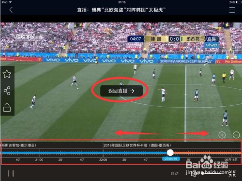 当然在这里,我们可以点击屏幕的右下角进行放年夜,放年夜后我们会看到下面有一个进度条,因为是回看所以你可以随意拖沓,然后中心有一个‘返回直播’的字样。点击后就可以回到直播球赛现场。