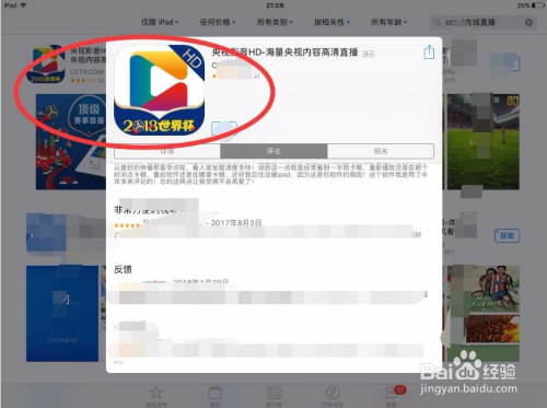 首先我们需要在ipad的app商城中搜刮‘央视影音’app,这个是和CCTV5同步的直播平台。点击下载安装。