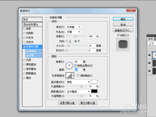 勾选斜面与浮雕,设置样式为外斜面,深度为450,偏向为下,大小为10,角度为90,高度为60,勾选全局光。