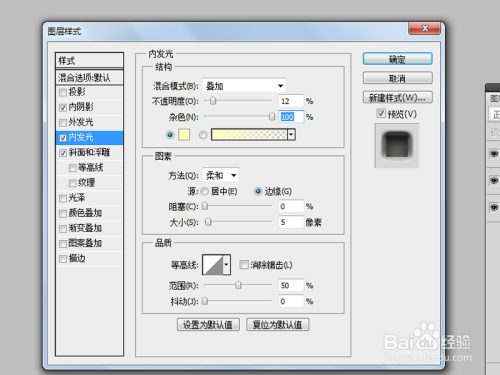 接着勾选内发光,设置夹杂模式为叠加,不透明度为12%,杂色为100,大小为5,规模为50.从头点窜斜面与浮雕的样式为内斜面,点击确定。