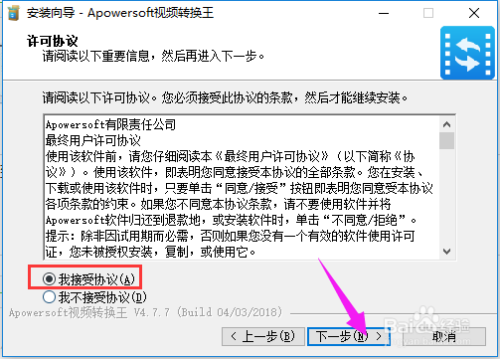 来到这个许可页面,选择我接管和谈,点击下一步,如图所示