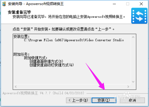 在附加使命页面,默认即可,点击“下一步”,将会安装筹办法式,点击“安装”,你就会看到安装进度了,期待安装进度完毕即可,如图所示