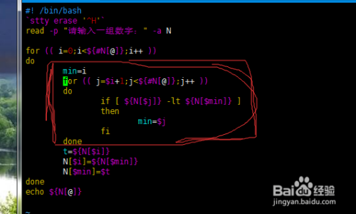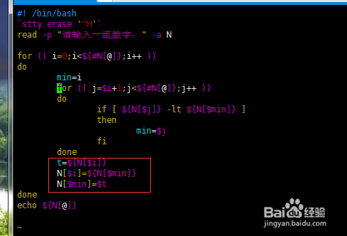 如图 画圈的 代码,就是界说 一个 min 变量记住轮回内 数字的位置 ;然后经由过程 二层 for 轮回进行比力,若是 后面的变量 $j 这个下标代表的数字 ${N[$j]} 比 $min 代表的数字小,那么 就用 min标识表记标帜这个数,半斤八两于交换下标了;