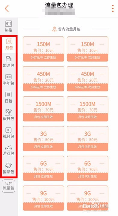 点击“流量月包”后,就可以看到左侧菜单有流量包选择,可按照本身需求选择月包、加油包、半年包、日包、沐日包、视频包、游戏包、国际包等分歧类型流量包。