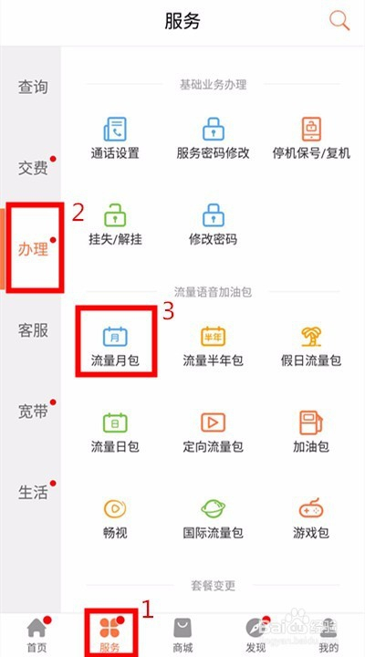 打开APP后,点击菜单下方“办事”,点击左侧“打点”,再点击“流量语音加油包”可点击“流量月包”或肆意一个流量包。