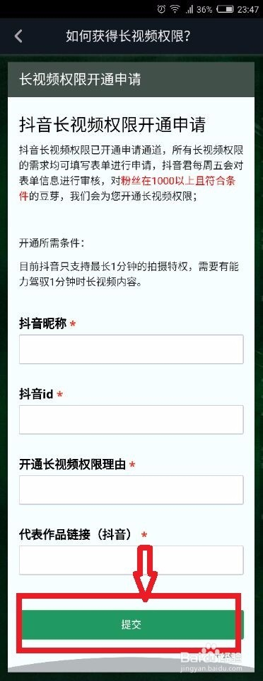 然后按照开通的要求来填写相关的信息,填好后点击【提交】,期待审核经由过程后就可以拍摄长视频了。如图9 注重:申请长视频权限需要有粉丝一千以上且合适申请前提。
