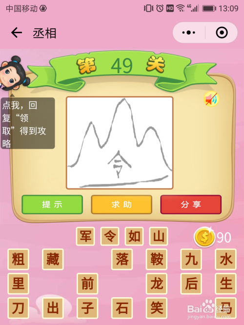 丞相49关谜底:山上写着一个令字,如许获得山和令这两个关头字,这便猜到谜底是【军令如山】。