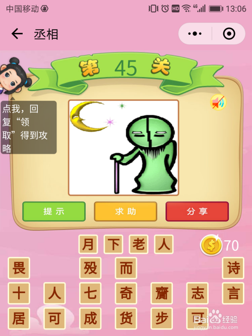 丞相45关谜底:月亮下面有小我拄着手杖在行走,拄着手杖这个特点申明是白叟,这即是当作语【月下白叟】,是指做媒的人。