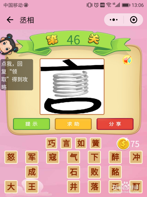 丞相46关谜底:言字中心有根弹簧,猜到言、簧两个关头字,按照这两个字便轻易猜到【巧舌如簧】。